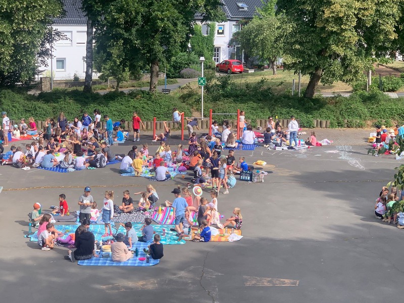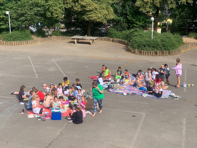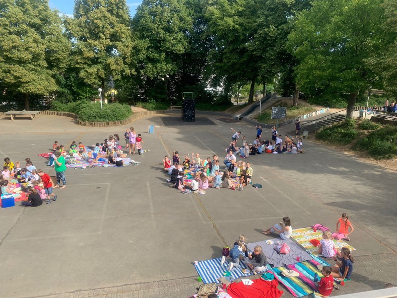 Am Donnerstag den 13.07.2023 fand bei schönstem Sonnenschein ein gemeinsames Picknick mit allen Kindern und Lehrern der Schule statt. Alle Klassen trafen sich auf dem Schulhof und jeder brachte eine Kleinigkeit zum Essen oder Trinken mit.