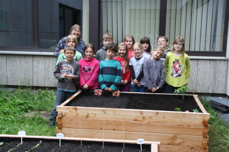Die Klassen 2a und 2b gewannen mit ihren Klassenleiterinnen Frau Braun und Frau Hanke-Rett bei Ausschreibung von "Team mit Stern" vom Gerolsteiner Sprudel zwei Hochbeete.